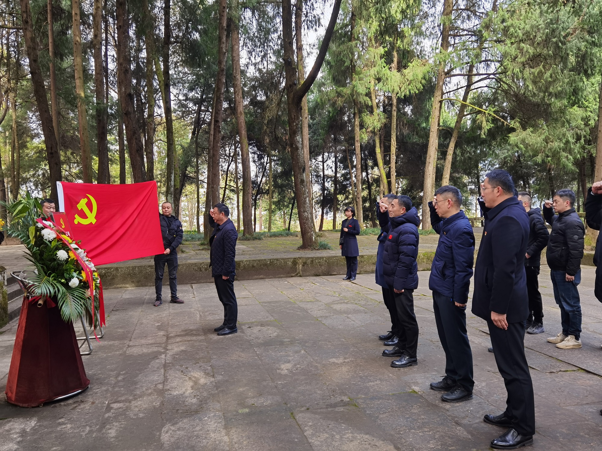 在通江縣王坪烈士陵園,從“鐵血丹心”廣場拾級而上,公司黨委副書記、副總經(jīng)理郎波、公司黨委副書記、紀(jì)委書記陳雷、公司黨委委員、副總經(jīng)理袁本松率公司黨員、入黨積極分子一行來到烈士紀(jì)念碑前,莊嚴(yán)肅穆的肅立,默哀鞠躬,向長眠于此的革命英烈表達(dá)無盡的哀思和敬仰。郎波代表公司黨委向革命先烈敬獻(xiàn)花籃,機(jī)關(guān)黨支部書記葉發(fā)科帶領(lǐng)黨員同志在鮮紅的黨旗前,重溫了入黨誓詞。
