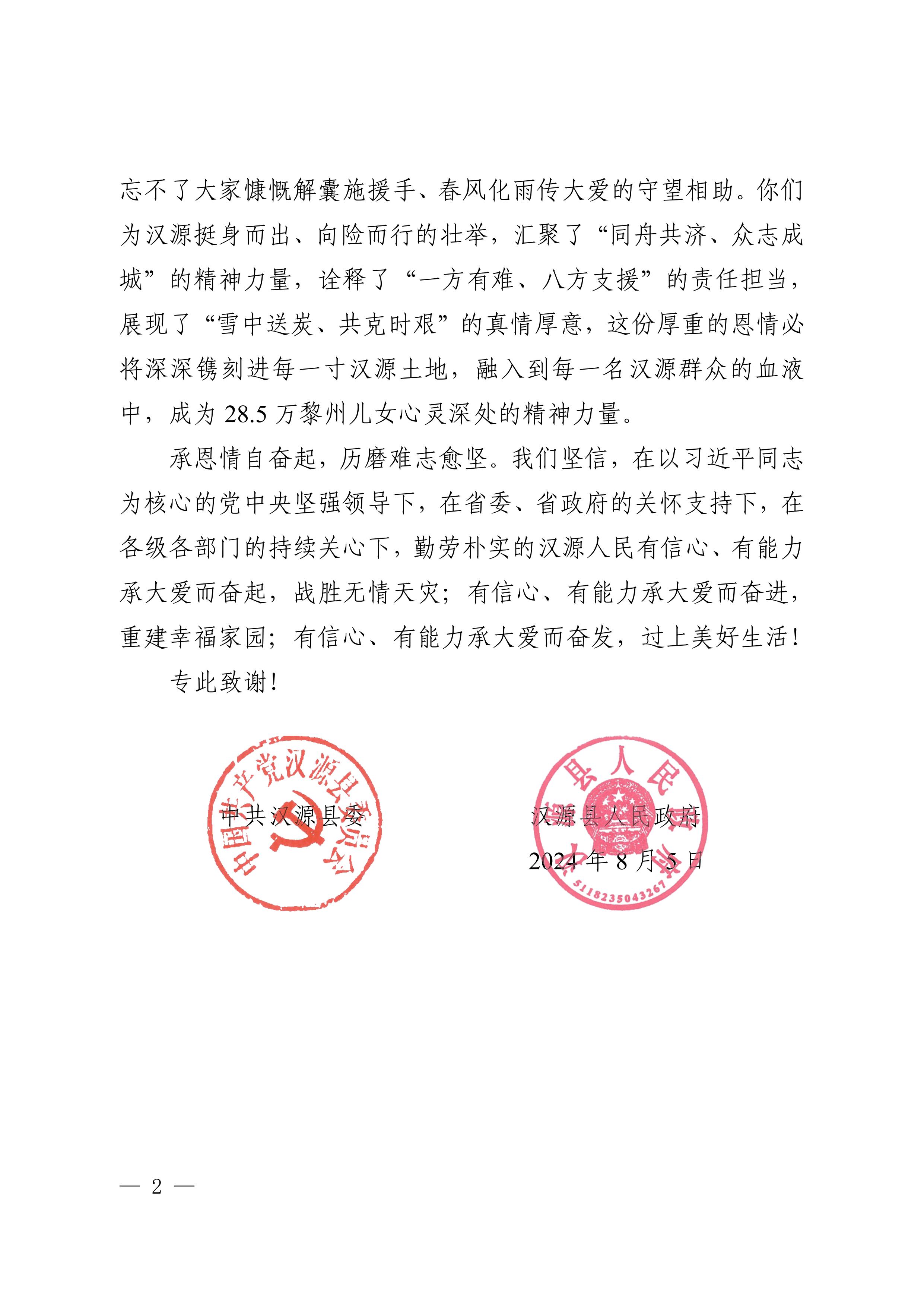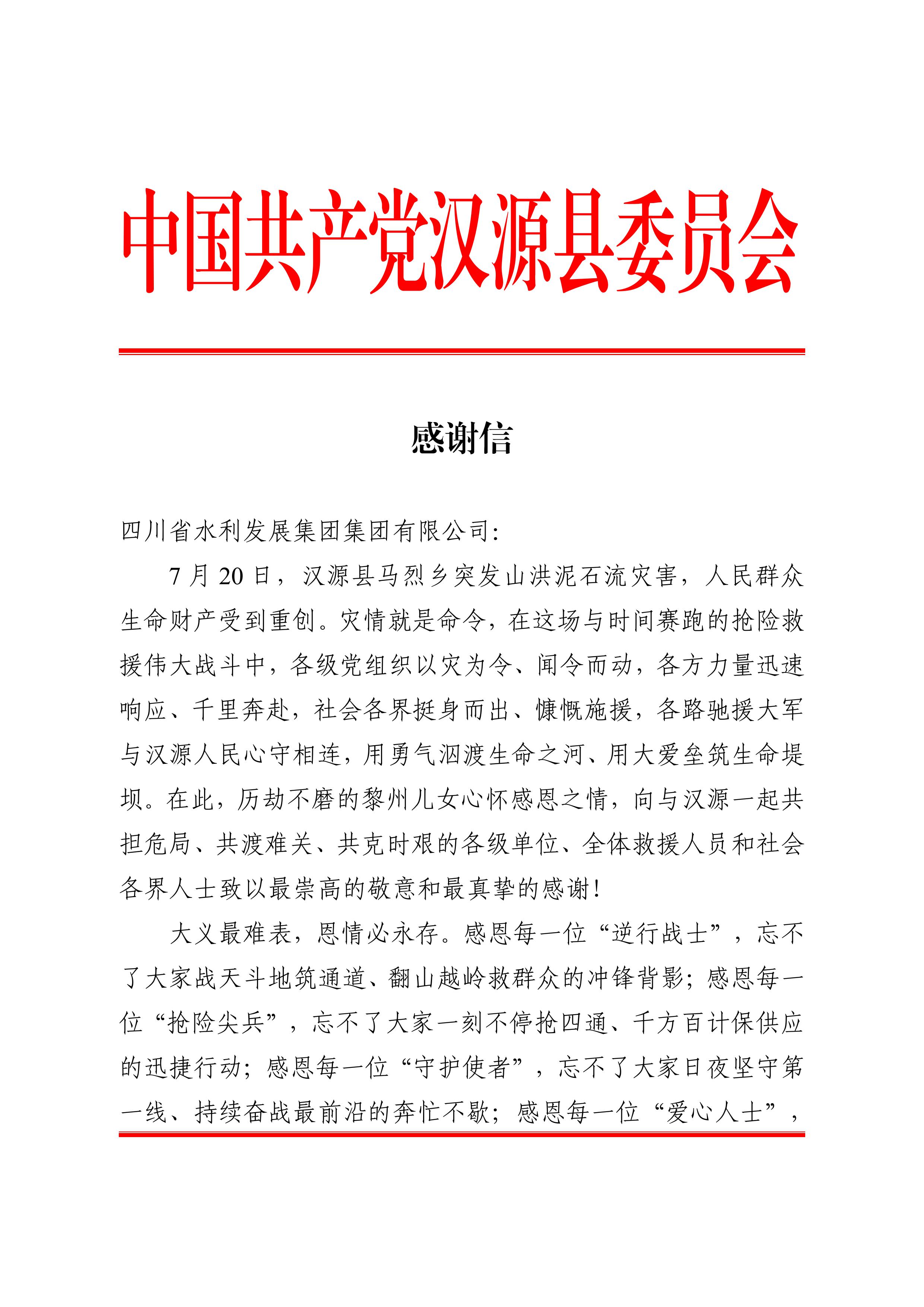 馳援漢源 全力守護——四川水發收到來自中共漢源縣委、漢源縣人民政府發來的感謝信